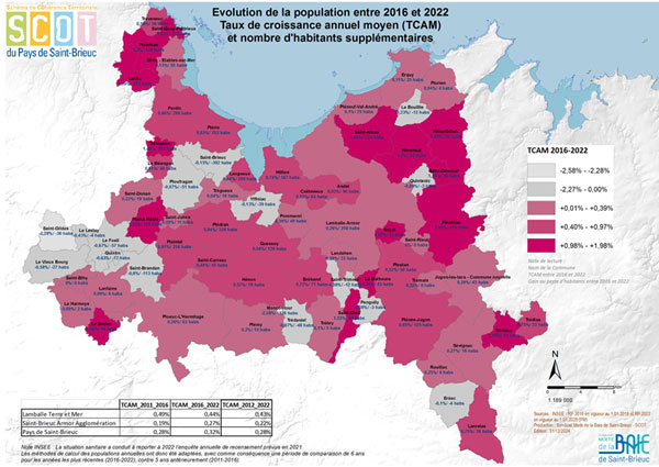 La croissance démographique ralentit très lègèrement sur le territoire de Lamballe Terre et Mer (+0.44% entre 2016 et 2022 contre 0.49% sur la période précédente 2011-2016) et est en hausse sur le territoire de Saint-Brieuc Armor Agglomération (+0.27% entre 2016-2022 contre 0.19% sur la période précédente 2011-2016).